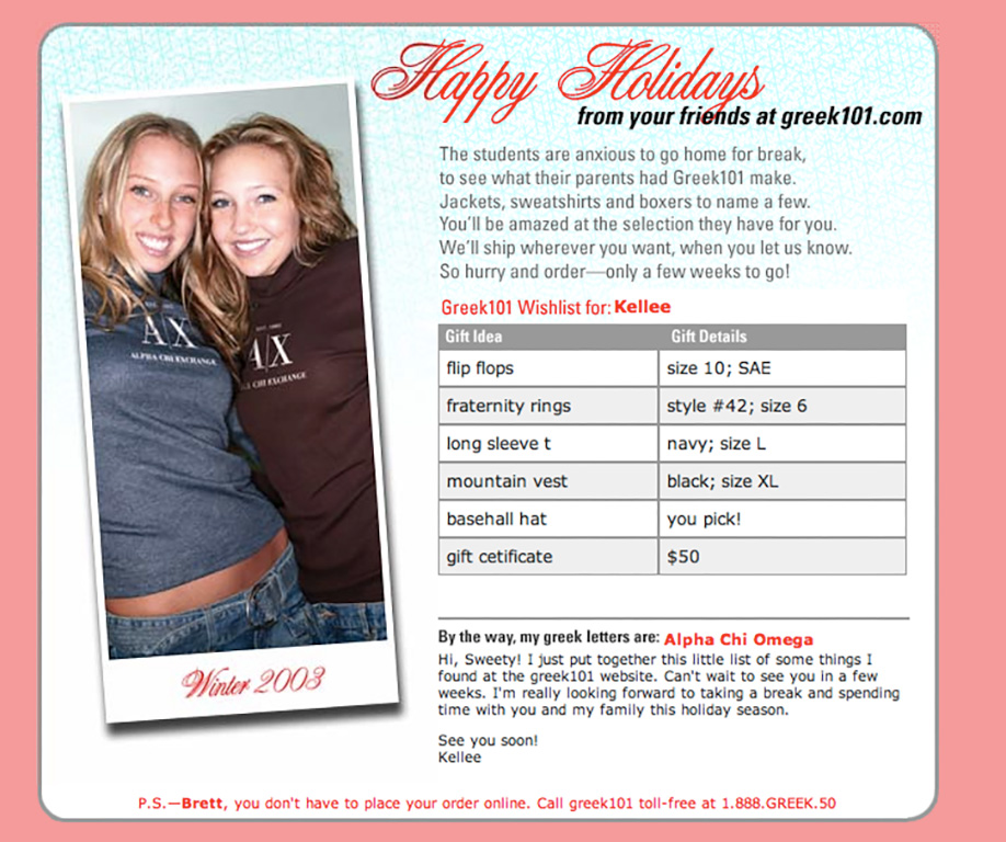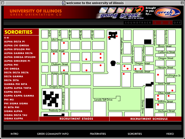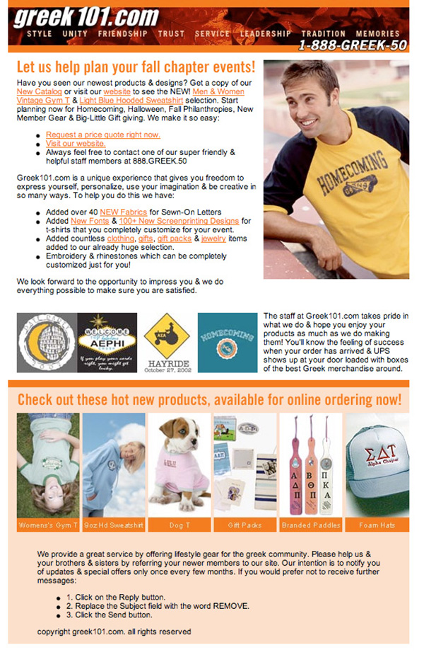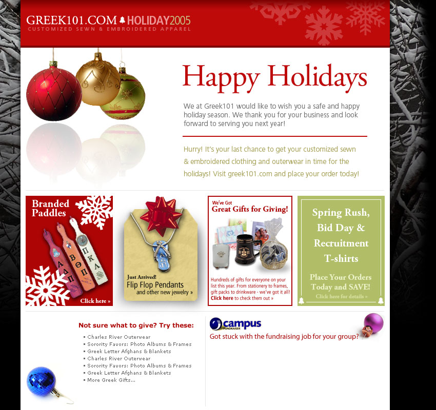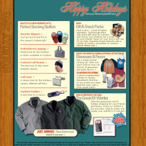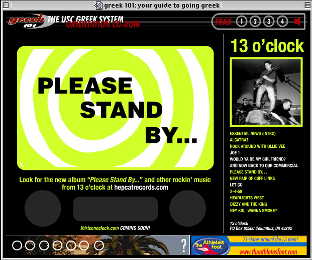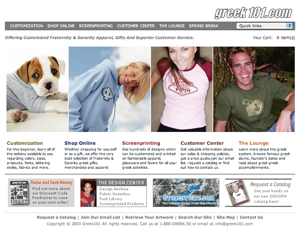 An archive of various projects for a college screenprinting business, back in the early days of e-commerce websites, circa 1999-2000. Also some of the first HTML emails, which were super painful to create and test back then. Finally, a bunch of screen grabs from a line of freshman orientation CD-ROMs sent to incoming students at USC, Villanova, Northwestern and more. Those were a lot of fun, and I got to learn a ton about Macromedia Director (remember that? me neither.)