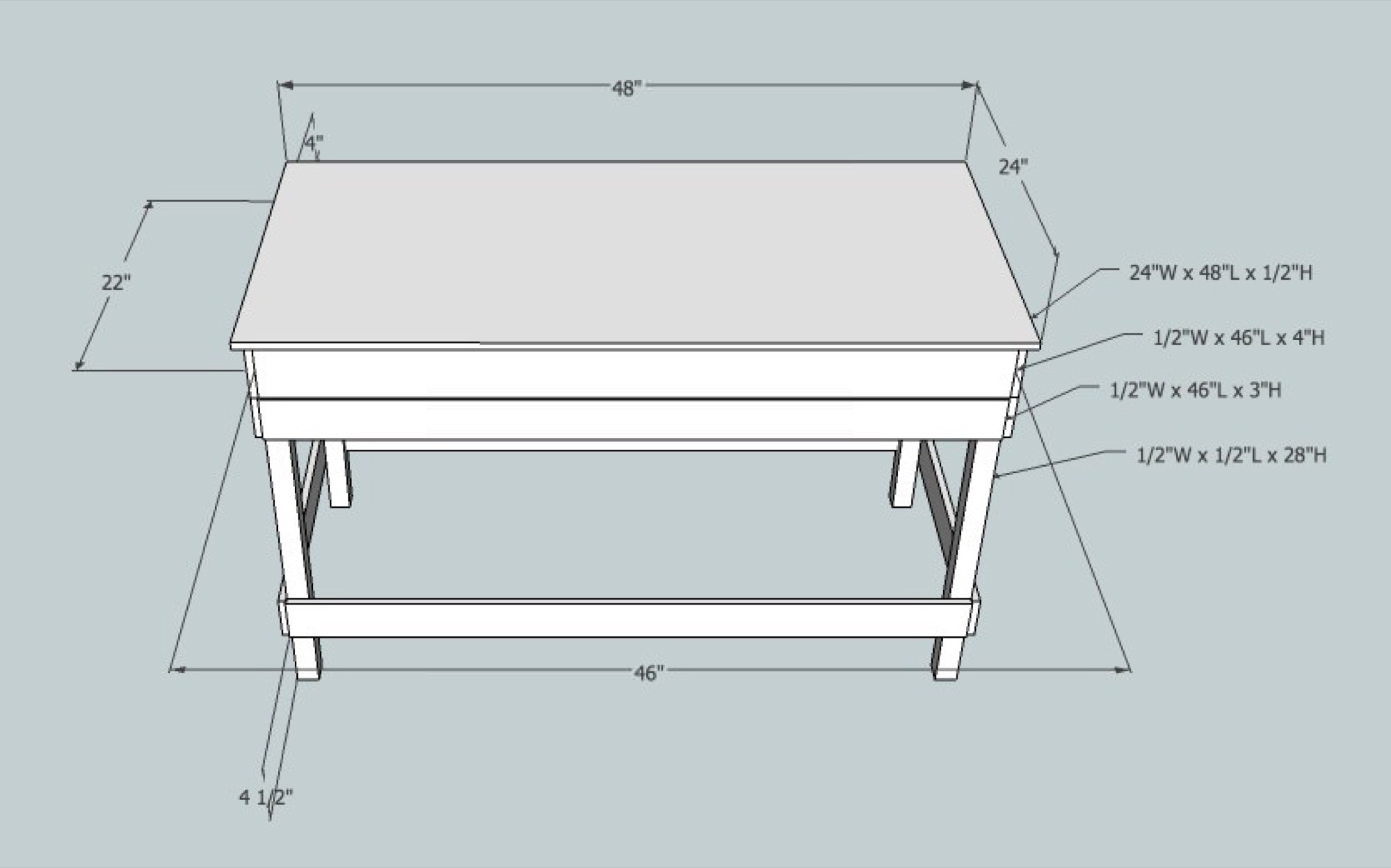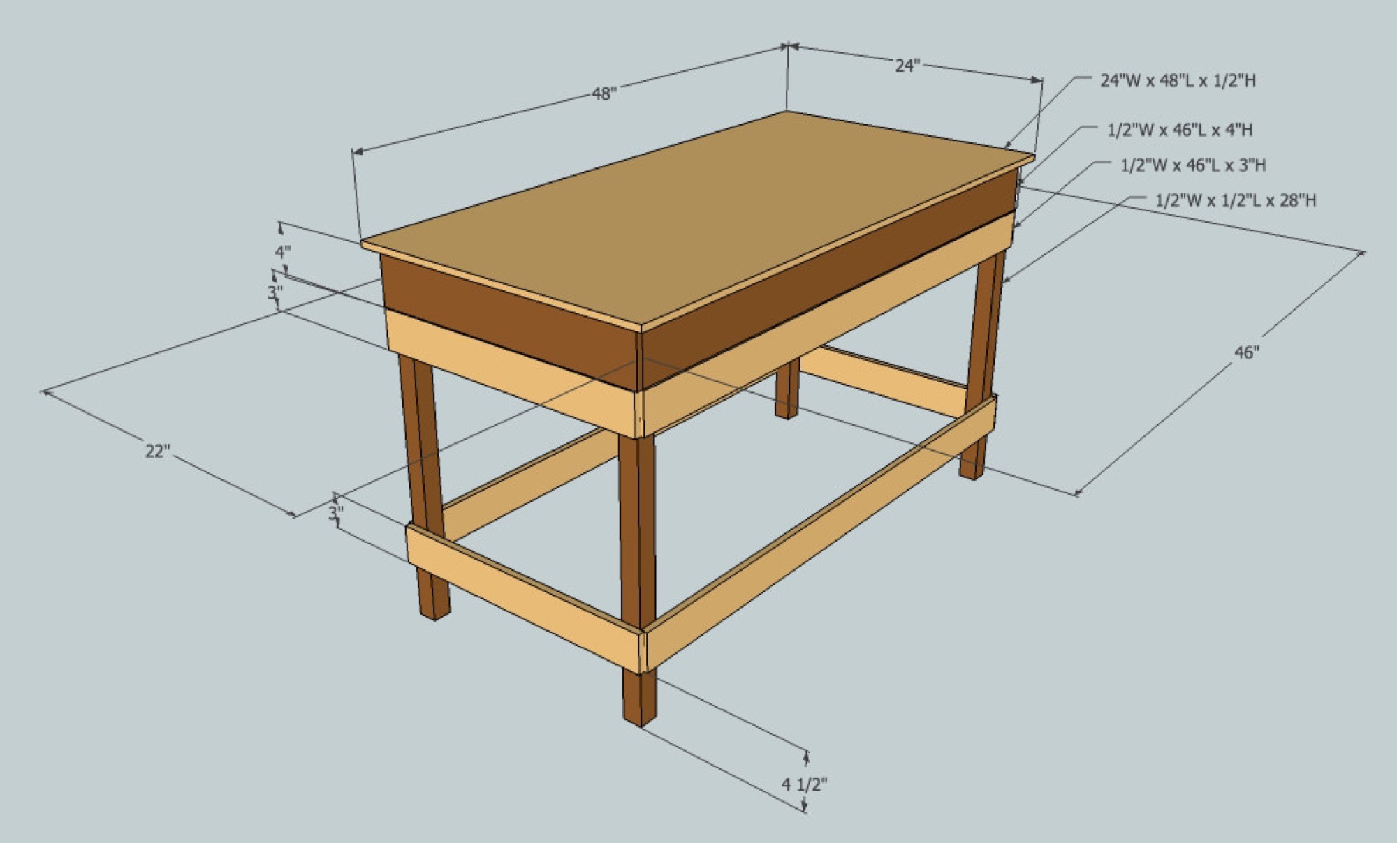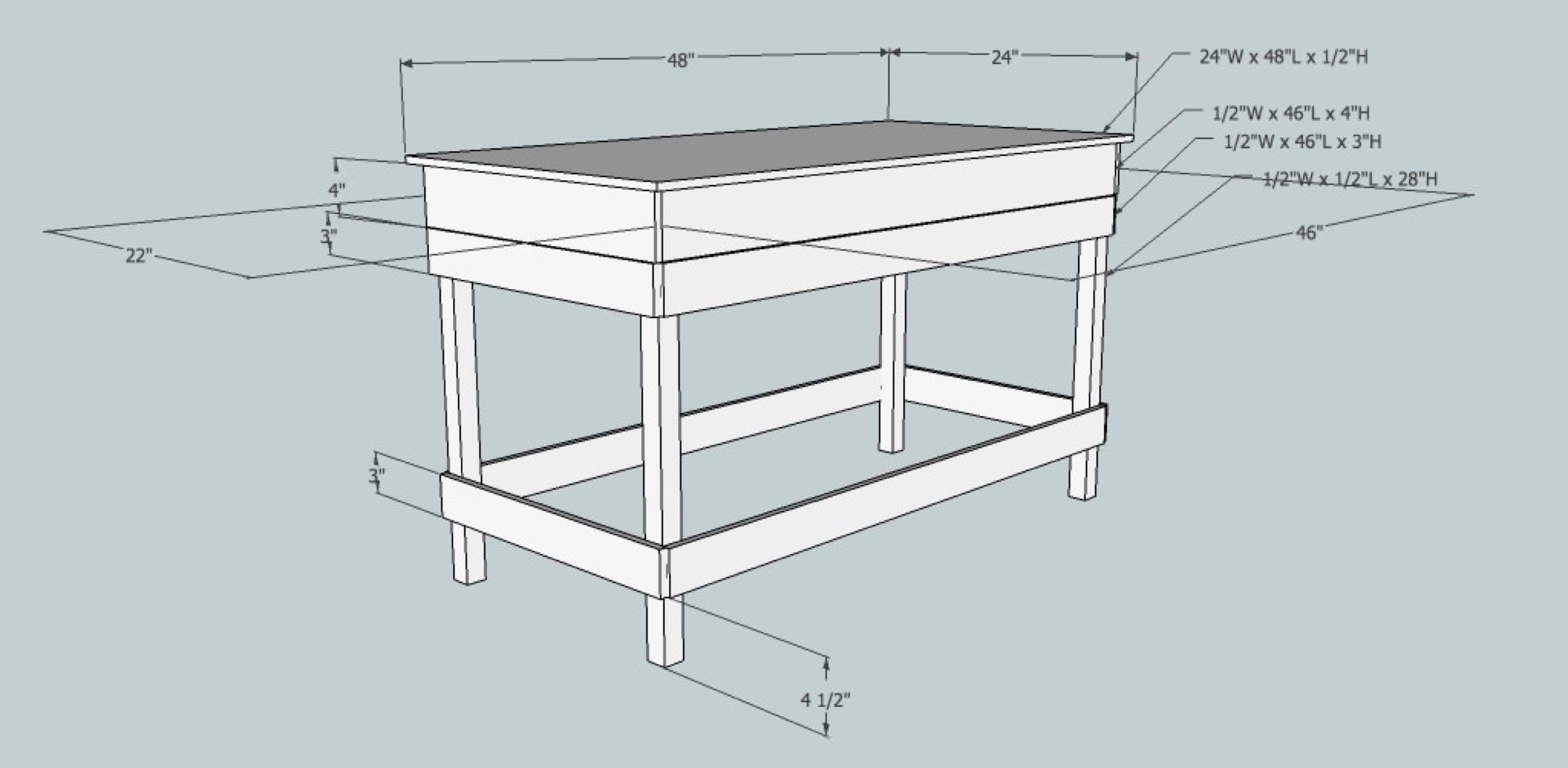 The first thing I need to do is build some benchwork. Most of the research I found show some pretty crude 2x4s with a plywood top. If this was going in a basement or garage, that would be fine, but mine is going in a finished office alongside some pretty decent furniture. A poorly constructed, rough table sitting in the corner is going to look really out of place and could cause enough of a stir in the house to scrap the entire project. I did a little sketching on graph paper and then gave Google SketchUp a shot to polish things up. I had never used it before, but after fooling around for an hour or so I started to get the hang of it. All the images in this post are rendered out from that app.