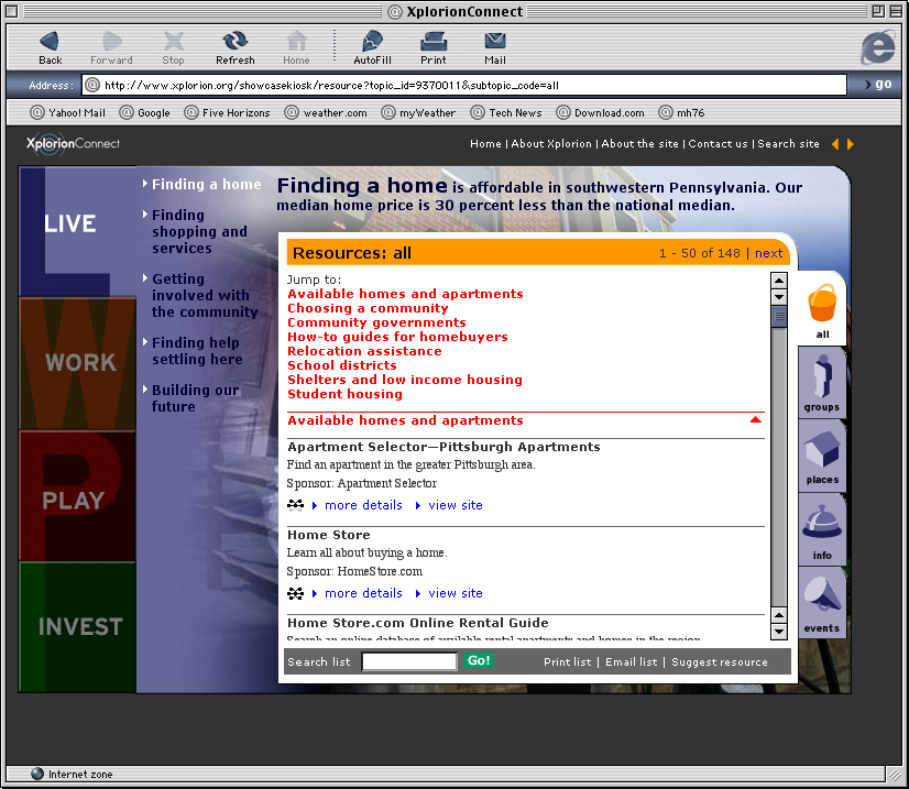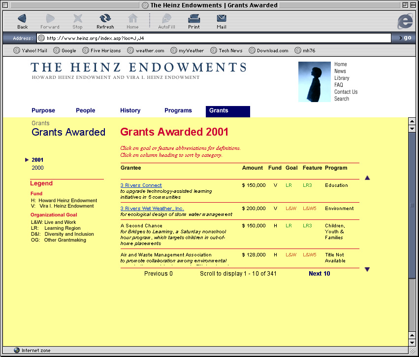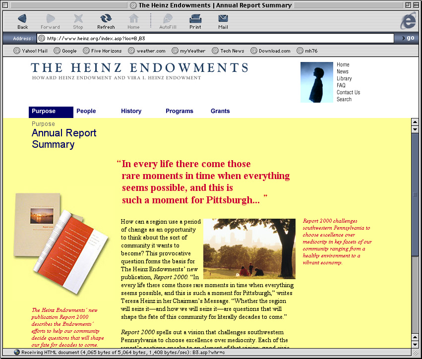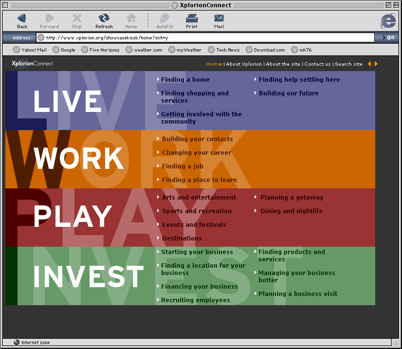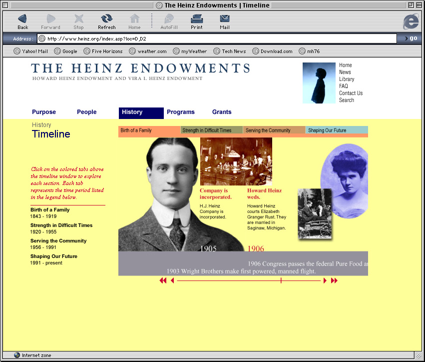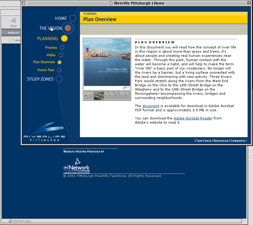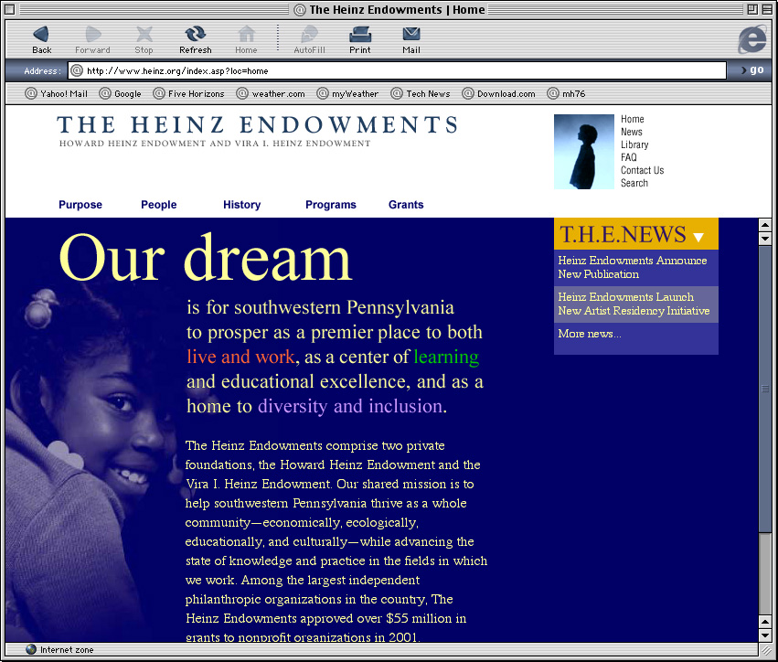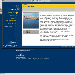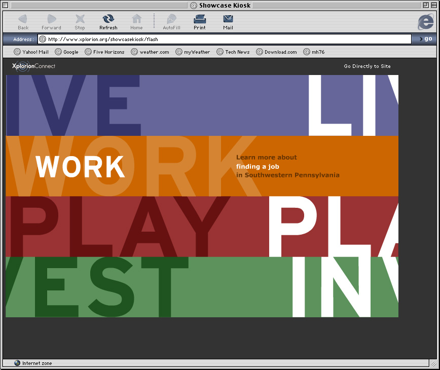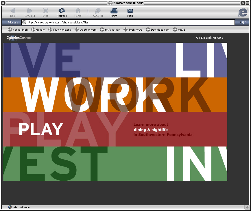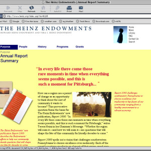Spent a couple years at a design firm in Pittsburgh, Agnew Moyer Smith (AMS). Probably the job where I learned the most from the people around me. Some really talented people there, especially exciting since we were all learning how to create online spaces for companies and organizations of all kinds. Circa 2000-2002. Gallery is a collection of websites, flash animations, flash interfaces for physical installations. Worked on a lot of neat projects in those two years.