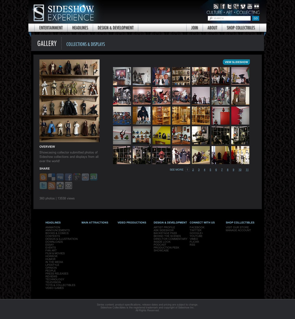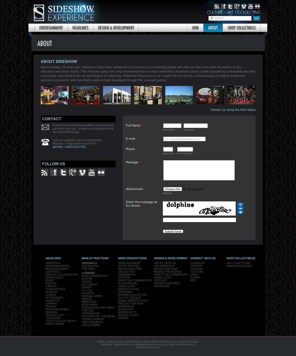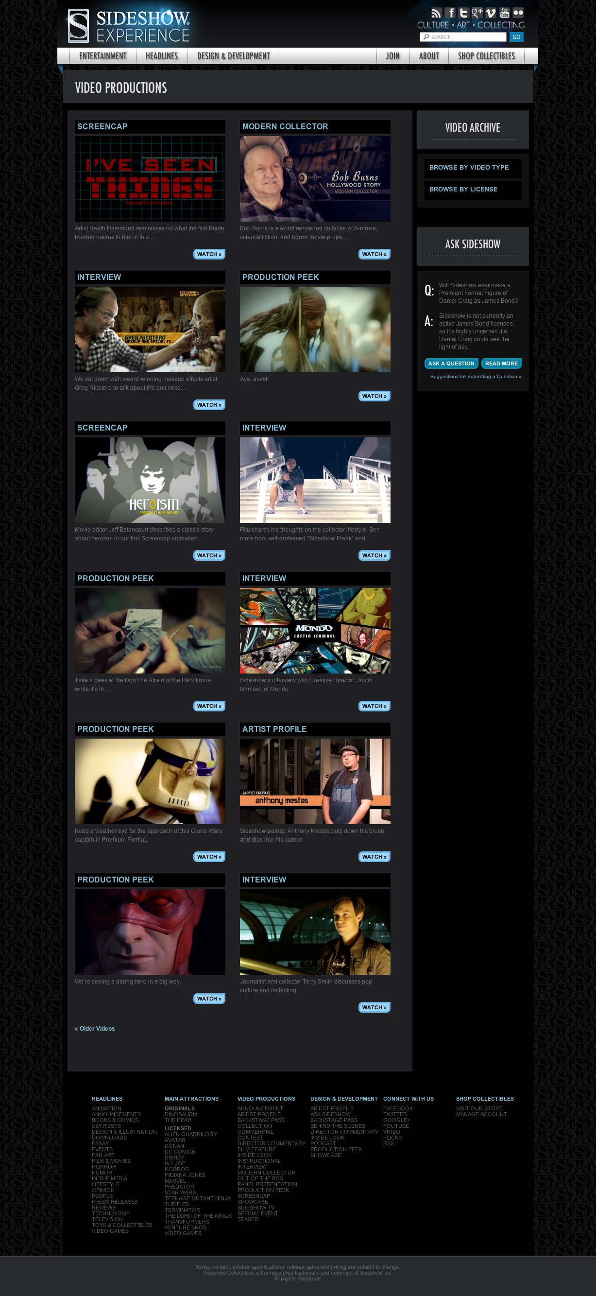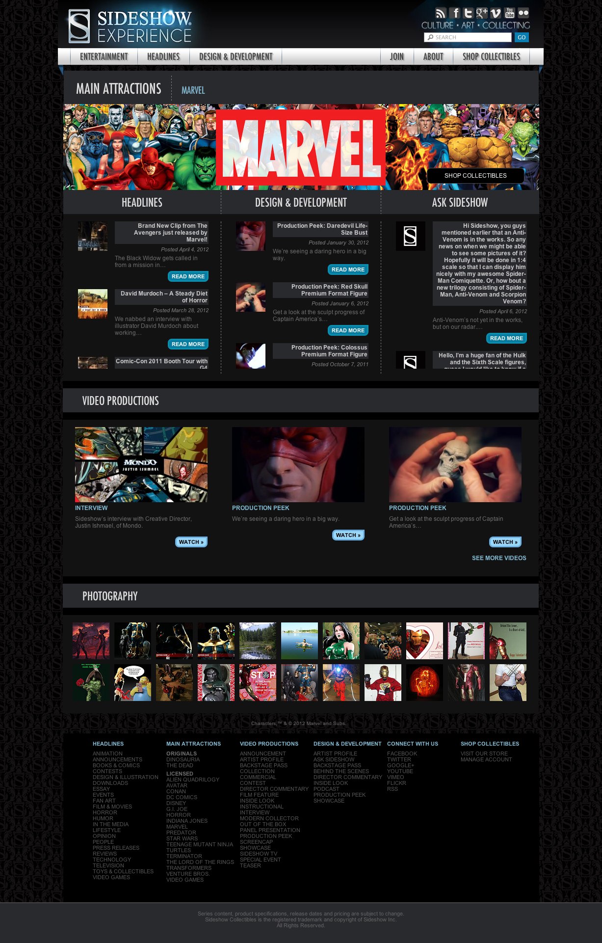 Working on the same "corporate" website for 10 years (let alone, almost 20 at this point), may seem like it could get stale. But at Sideshow, I'm fortunate enough to be a part of a great team of creative people - visually and technically - and we're never afraid to wipe the slate clean and start again. This is a fraction of the projects and pages created throughout my first ten years. Highlights include an "Experience" site featuring multimedia elements and pop culture news, various content pages and some screenshots of our first mobile site.