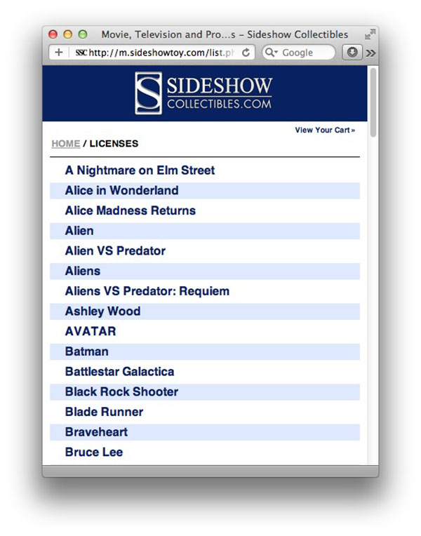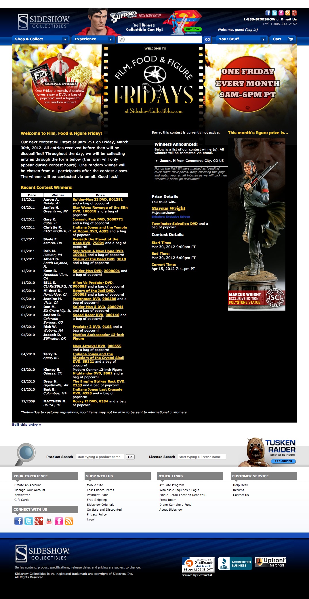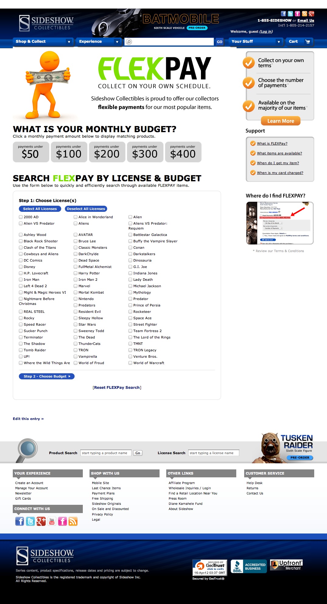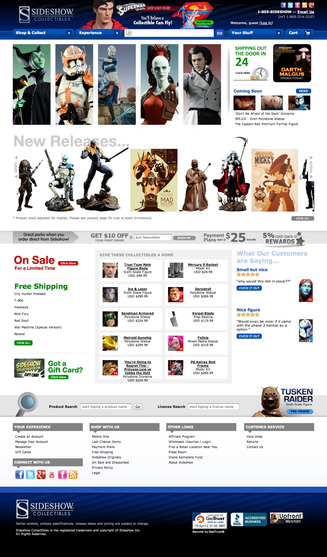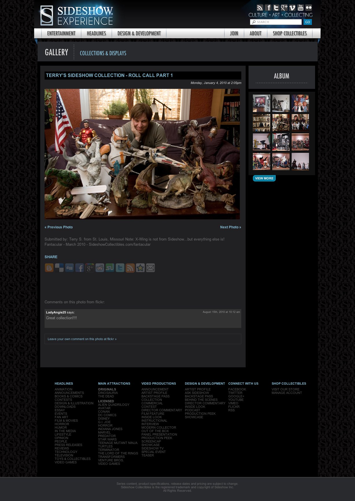 Working on the same "corporate" website for 10 years (let alone, almost 20 at this point), may seem like it could get stale. But at Sideshow, I'm fortunate enough to be a part of a great team of creative people - visually and technically - and we're never afraid to wipe the slate clean and start again. This is a fraction of the projects and pages created throughout my first ten years. Highlights include an "Experience" site featuring multimedia elements and pop culture news, various content pages and some screenshots of our first mobile site.